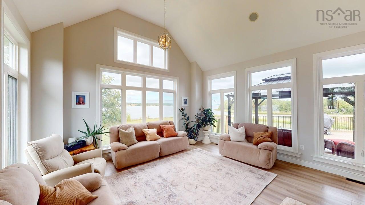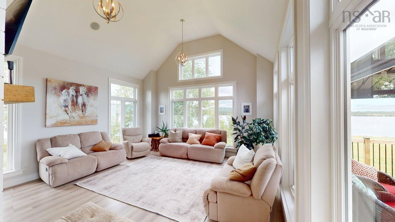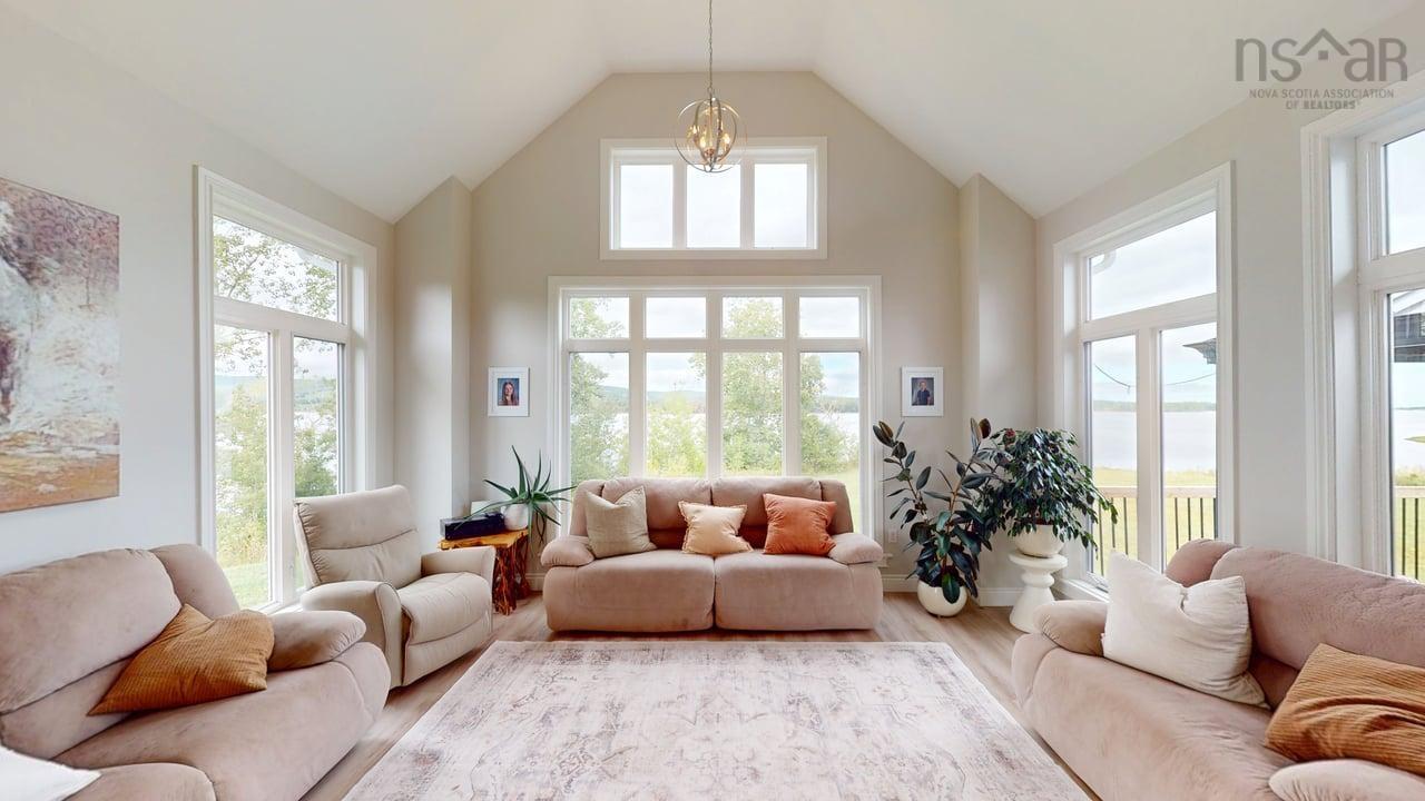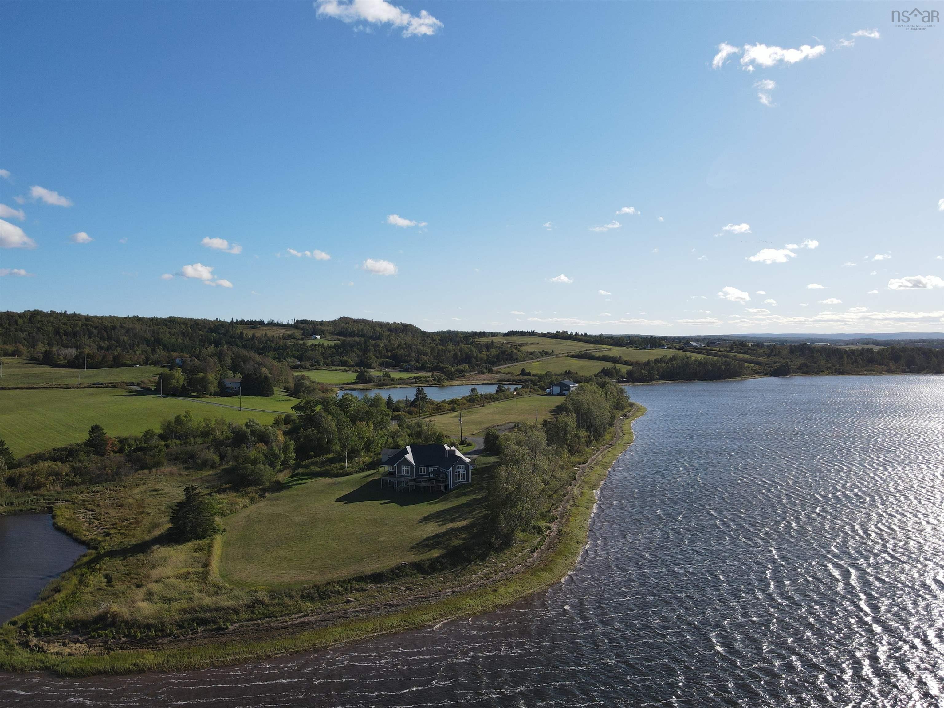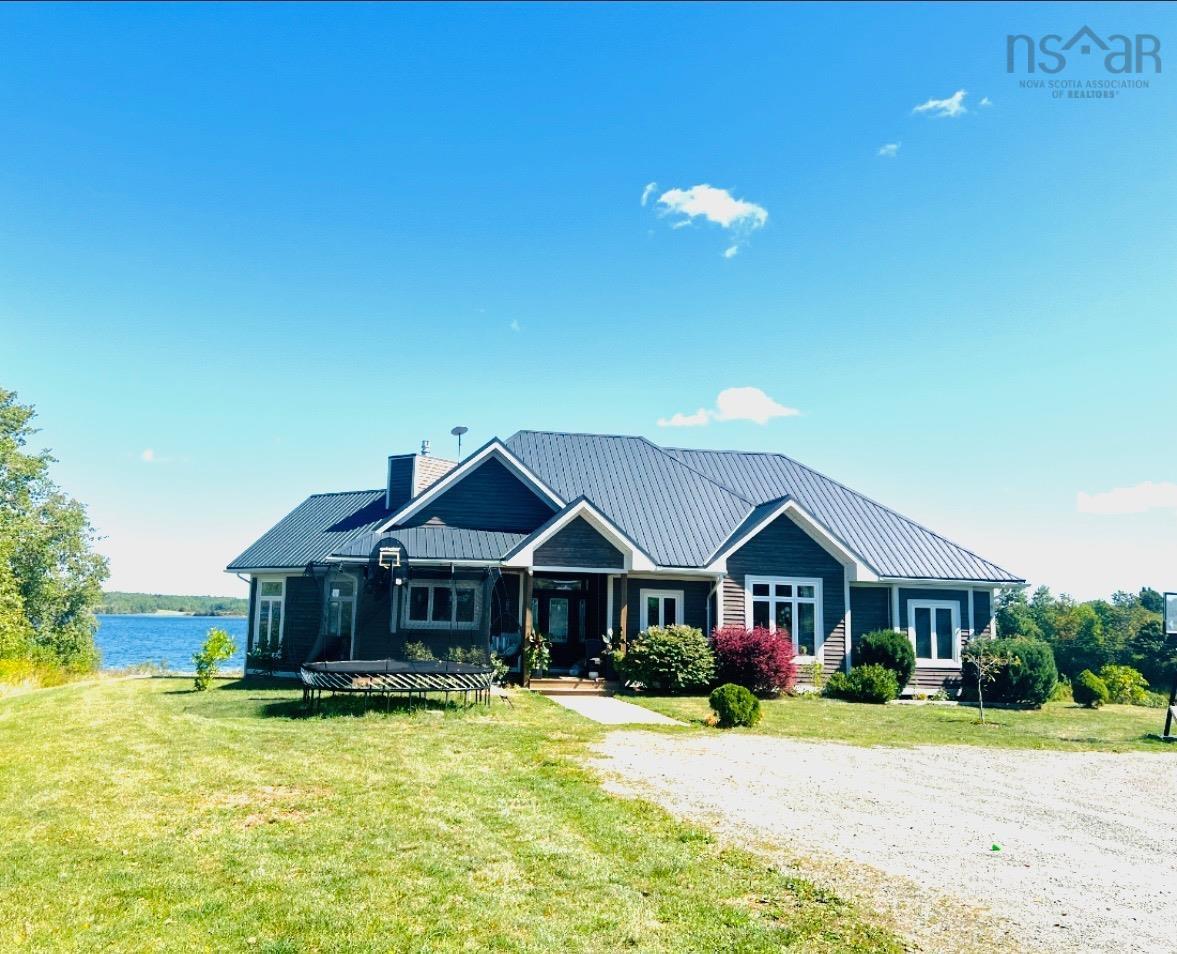 Visit REALTOR® website for additional information. This executive-style home offers elevated features and 500 feet of water frontage on three acres of serene property, just five minutes from the town of Antigonish. Step into a welcoming entryway, with a convenient coatroom off to the side, that flows into a bright, open dining area and kitchen. The kitchen features a solid surface marble counter with bar seating, while a two-way propane fireplace-updated with floor-to-ceiling shiplap-creates an elegant focal point between the dining space and the sunken living room. Here, dramatic ceilings and floor -to-ceiling windows frame extraordinary views of Antigonish Harbour. From the dining area, double doors open onto a spacious patio with sweeping panoramic vistas. The main level hosts the primary suite, complete with a large walk-in closet and a luxurious five-piece ensuite. Relax in the deep soaker tub while taking in water views, or enjoy the spa-like dual shower with double shower heads and smart controls. The primary bedroom also has direct access to a large deck, enhancing its bright and airy feel. In total, the home offers four bedrooms and three and a half baths. Downstairs there is a dedicated laundry room with a butcher block counter. The lower level features a large family room with walkout access to the backyard, a spacious bedroom with a walk-in closet, a separate playroom, and two additional rooms ideal for office or hobby space. Recent upgrades include a durable metal roof, a ducted heat pump system, updated lighting in the main living area, and a generator hookup for peace of mind. This property combines the tranquility of rural living with the convenience of being minutes from town-an ideal retreat with modern comforts and unparalleled views.